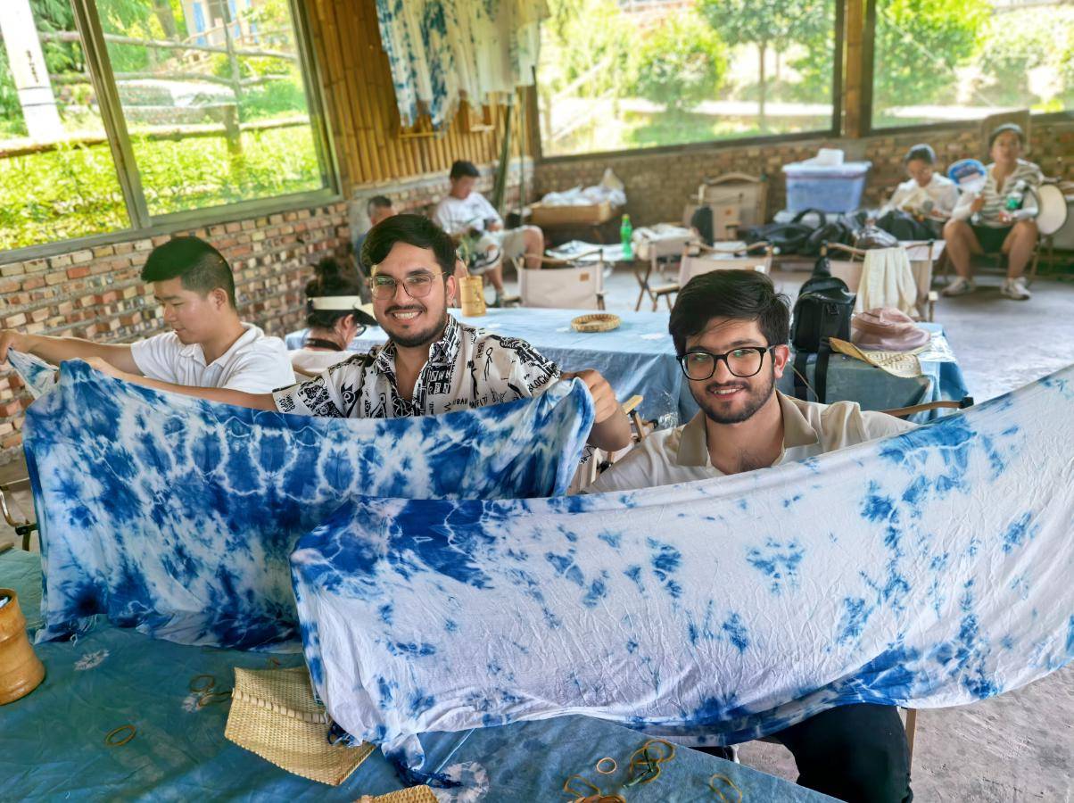授牌仪式后,与会人员深入西充乡村一线实地探访。在义兴有机村,留学生们手持剪刀体验剪纸技艺,揉捏陶土感受泥塑创作,领略非遗精粹;在莲池天兴桥村,扎染技艺赋能有机农产品包装、竹编器具盛放新鲜果蔬的创新场景,直观呈现了“文化+产业”融合的成果。探访期间,校地双方还围绕“医学健康理念赋能有机农业”、“非遗中的养生智慧”等议题展开研讨,为“医学+健康+有机产业”的跨界融合积累思路。