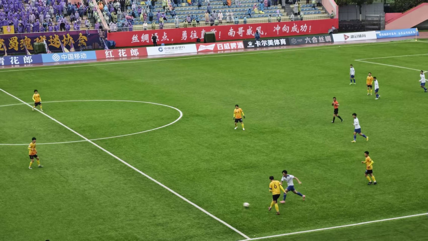 当天,小雨连绵,但现场氛围热烈不减。看台上,球迷们身披雨衣、挥舞旗帜,“南充雄起”的呐喊声此起彼伏,用饱满的热情为本土球队加油鼓劲。