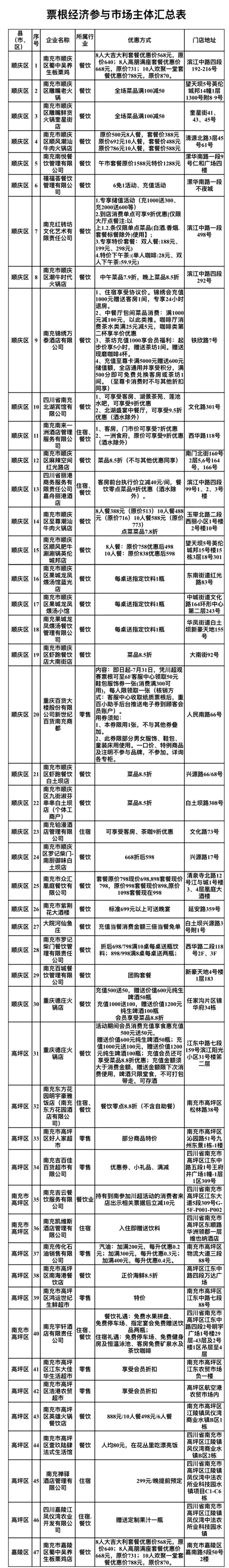 对持“川超”决赛阶段南充赛区纸质票/电子票(含购票凭证、核销记录)的球迷,持赛事工作证、球员证的人员,及持比赛前1天、后1天抵南火车票、机票、汽车票的外来游客,可享“票根”优惠。具体来看,优惠商家覆盖南充主城三区(顺庆区、高坪区、嘉陵区)优质餐饮、品牌酒店、商超零售及老字号门店,将为市民游客提供看球、吃饭、住宿、购物一券通享便利。