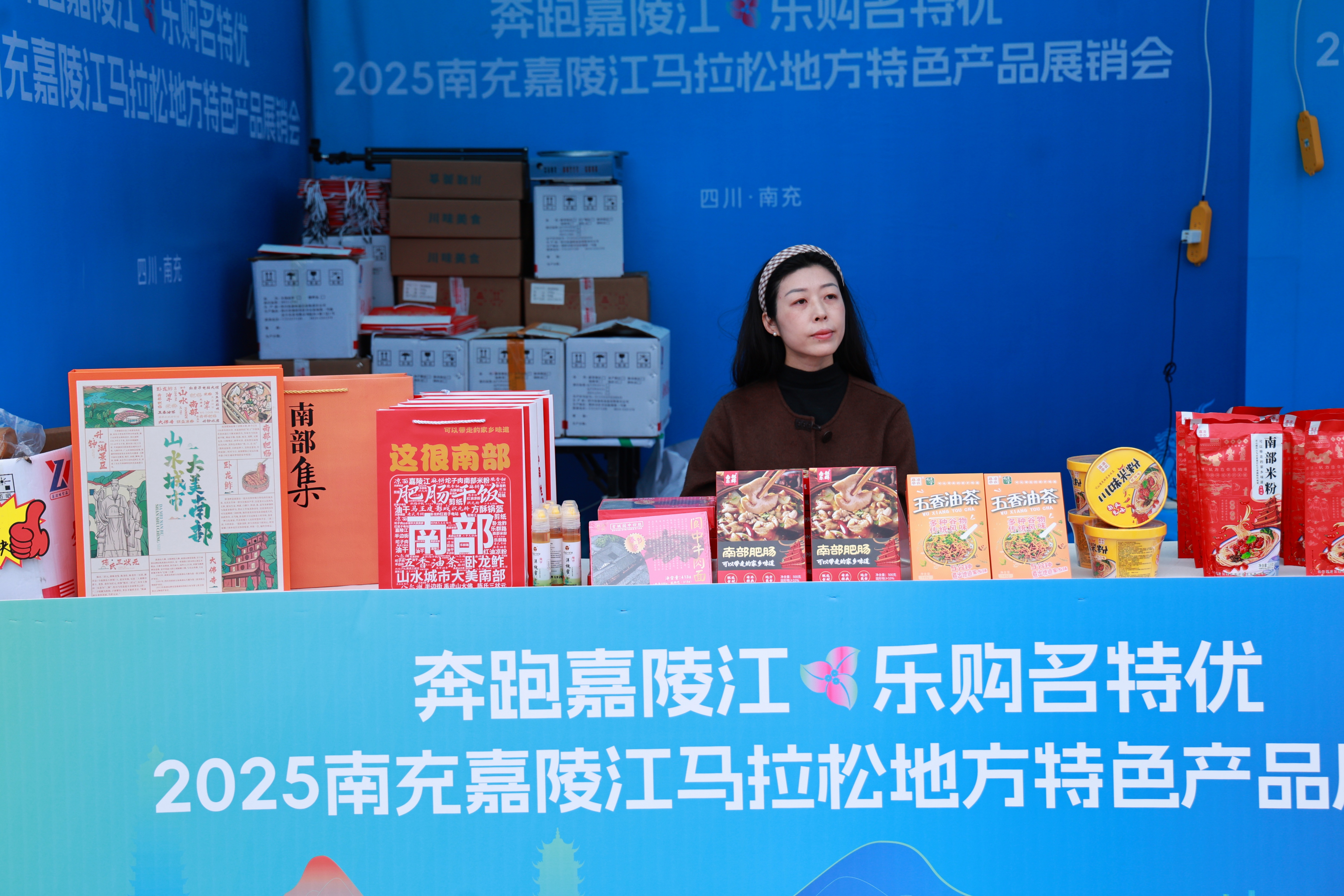赛事期间,主办方在起终点区域设置了农特产品展销区,集中展示南充优质农产品和文旅特色,为跑者与市民提供品鉴与购买体验,助力本地农产品推广。