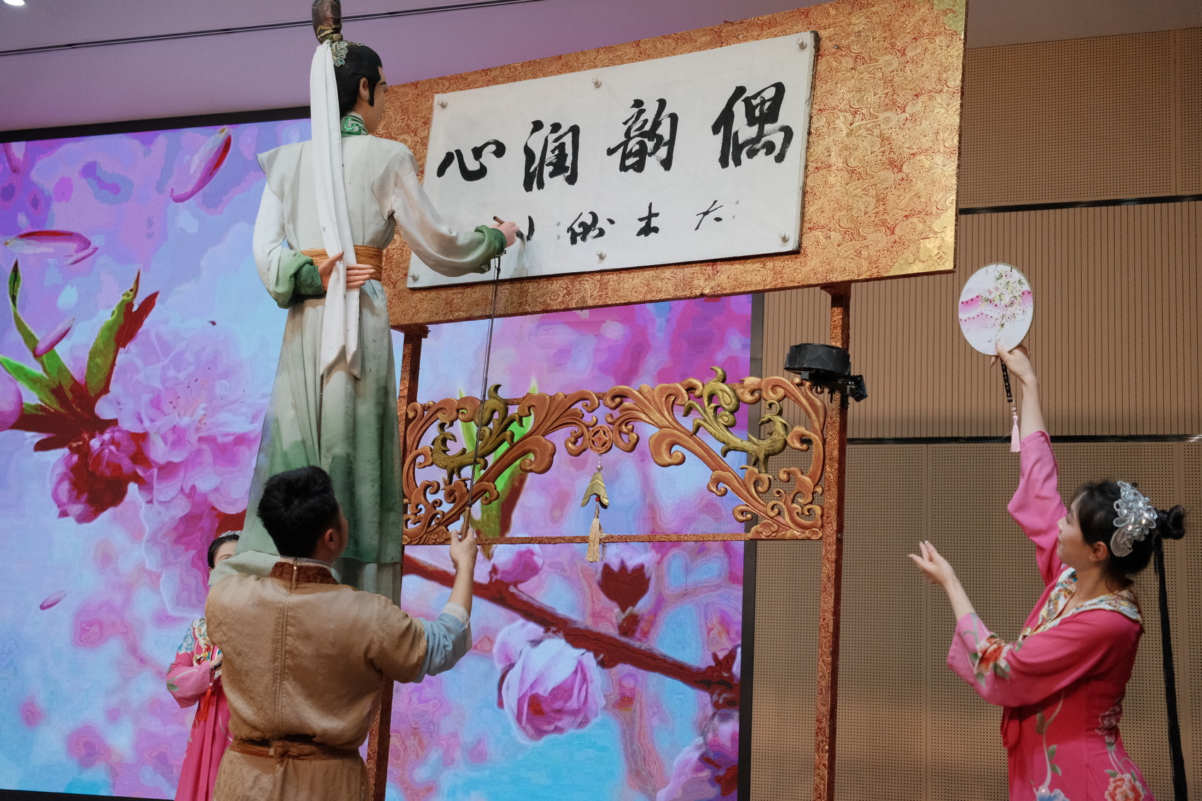大木偶剧《桃花韵·书艺》表演写字。田丽萍 摄