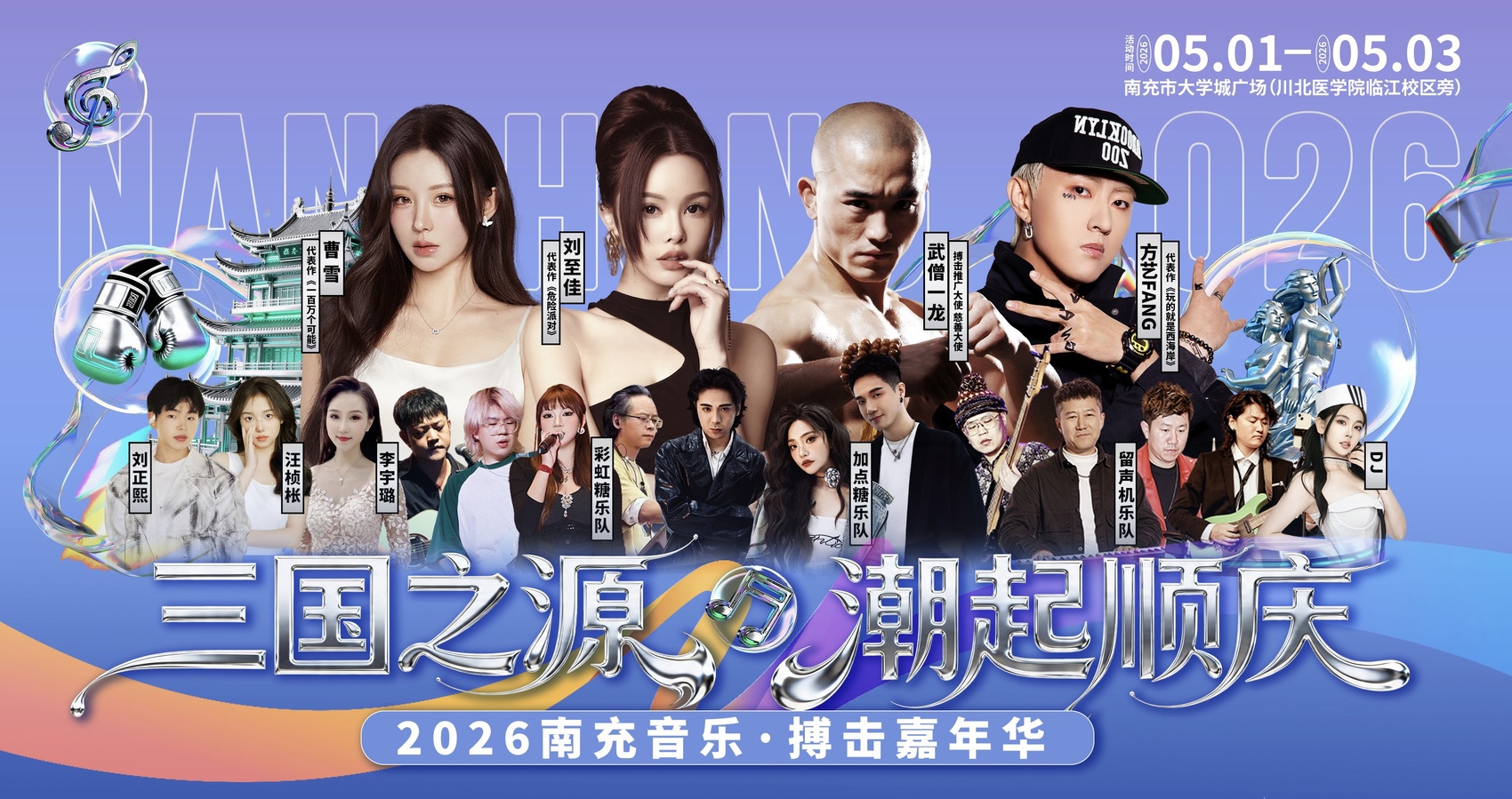 本次活动紧扣“三国之源・潮起顺庆”主题,深度挖掘南充三国历史文化底蕴,创新融合专业搏击赛事、流行音乐演出、电音DJ、沉浸式灯光秀、趣味互动抽奖等多元业态,打造传统文化、潮流体育与时尚音乐跨界碰撞的城市狂欢。届时知名歌手、人气乐队与职业拳手将同台献艺,白天上演热血搏击,夜晚燃动潮音狂欢,集硬核擂台、潮流音浪、趣味互动与美食体验于一体。