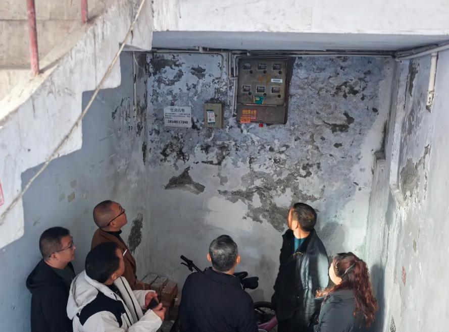 11月27日上午,24365中心联合县房管局、滨江街道办和东园街社区进行现场走访核实。经现场察看,东园街的居民楼在修建时,房屋后墙紧靠着原大南街人民医院宿舍楼下的堡坎,雨水沟的走向是顺着山体构成而修建,部分房屋的墙体与堡坎之间的距离狭小,导致一遇雨天该地段低层房屋出现雨水渗漏现象,涉及商铺和住户达10余家。在察看的过程时,还发现东园街78号楼梯转角处设置的公用电表箱,因雨水长期渗漏,水流便顺势而下,墙体已出现损毁迹象,不仅给居民上下楼带来不便,还存在一定的安全隐患。前期,东园街社区多次前往房管局核实查询该地段的居民维修基金缴纳情况,此街道大部分住户都未缴纳房屋维修基金,故无法启动使用维修基金。现场协调图片部门现场查看堡坎下面的雨水沟