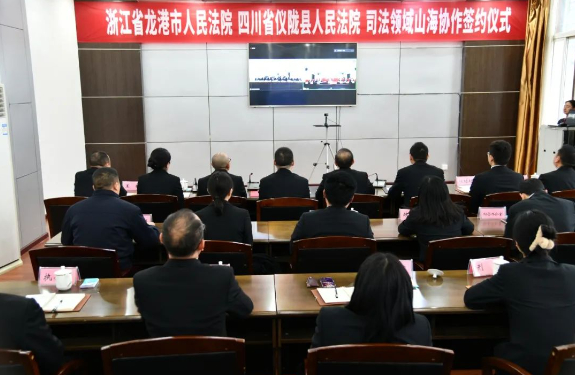 为以高质量司法护航经济社会高质量发展,11月30日,浙江省龙港市人民法院、四川省仪陇县人民法院通过线上方式,举行司法领域山海协作协议签约仪式。龙港法院党组书记、院长董忠波,仪陇法院党组书记、院长蒲泽川出席并致辞,两地法院常务副院长在线签订了《司法领域山海协作协议书》,双方在家院领导及相关部门负责人参加仪式。