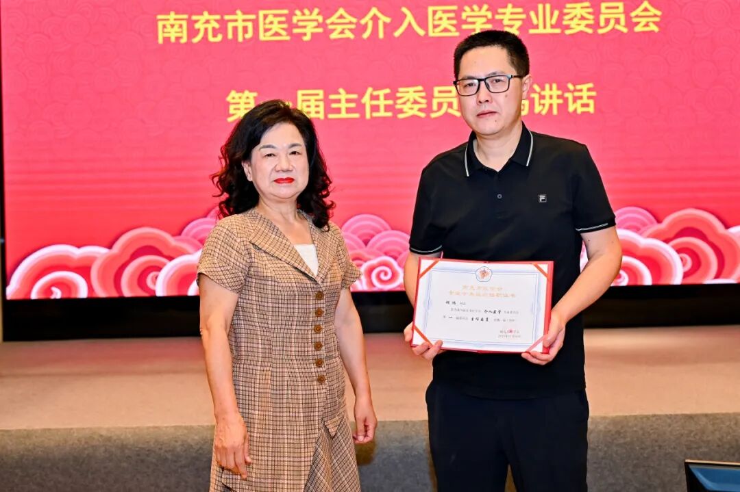 南充市医学会会长汪旭英为胡鸿教授颁发任职证书,并对介入专委会未来的工作提出三点希望:一要搭建高水平学术交流平台,积极引进先进理念和技术,促进区域内介入医学水平整体提升;二要推动介入技术规范化、同质化发展,加强人才培养和梯队建设,保障医疗质量和安全;三要强化多学科协作,充分发挥介入医学在疾病综合诊疗体系中的桥梁作用,为南充及周边地区患者提供更优质的医疗服务。