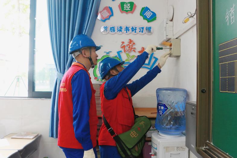 5月28日,国家电网四川电力(南充营山)连心桥共产党员服务队队员刘建明、何林在营山县红光小学对用电线路设备进行检查,确保用电安全。唐雪婷 摄