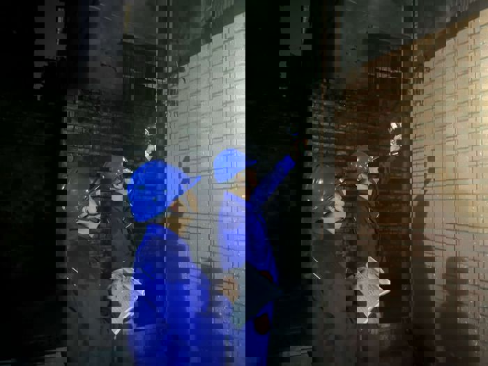 四川南充营山县供电公司员工李三、郭京山在35千伏骆市变电站测温巡视1号主变(钟剑 摄)