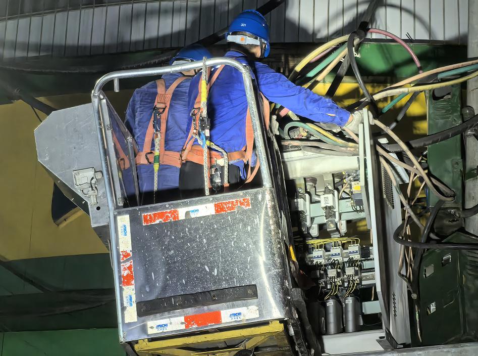 9月2日21时30分,10千伏城东线巴巴寺街台变处,在做完现场安全措施后,高空作业车上,驾驶员操纵升降平台将两名作业人员小心地送至变压器低压补偿柜旁,作业人员熟练地对低压补偿柜出线 B相因桩头发热导致破裂的瓷套管进行更换,连接出线。