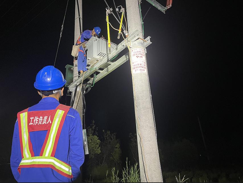 11公里外,10千伏庙场二线河溪何家坝村李家坝台变因下午的雷击导致变压器损坏,抢修人员顾不得吃晚饭,立即开展现场勘察,办理工作票,马不停歇组织抢修,于22时45分成功更换变压器,恢复供电。
