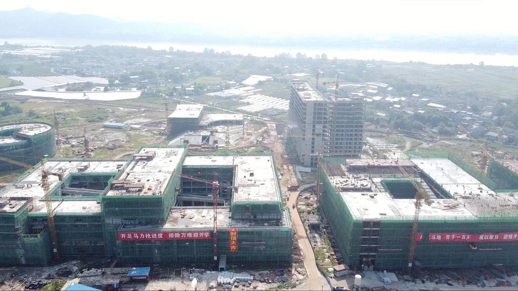 8月12日,南充大学城项目现场,南充电影工业职业学院学院建设正紧锣密鼓进行着,原本坑坑洼洼、杂草丛生的一片荒地早已被热火朝天的施工现场取代。