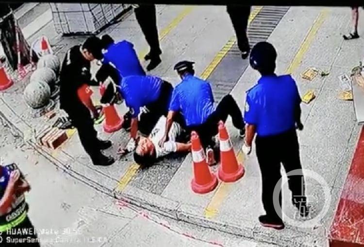 ▲监控显示,冲突发生后,店主戚涌泉被多名城管工作人员控制在地。图片来源/视频截图