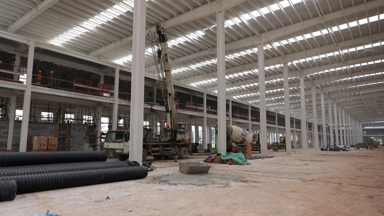 日前,记者从阆中智能制造近零碳产业园建设现场了解到,该产业园首批厂房钢结构框架已搭建完成,正进行厂房围护结构安装及室内装饰装修作业。产业园现场负责人周小强介绍,首批厂房已完成总建设进度的90%,预计本月底可交付使用。