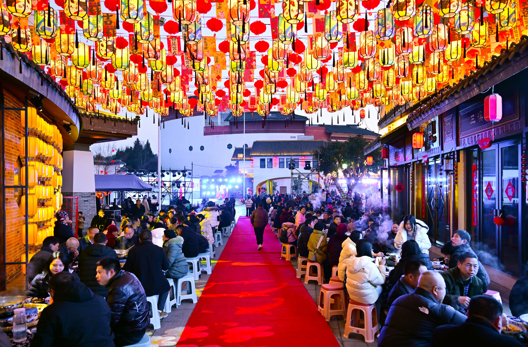 烟火气里藏团圆,客家宴上暖人心。18时,100桌客家簸箕团圆宴在耕读广场整齐排布,坨子肉、骑龙湖瘦身鱼等特色菜品,千人同席共品客家风味。