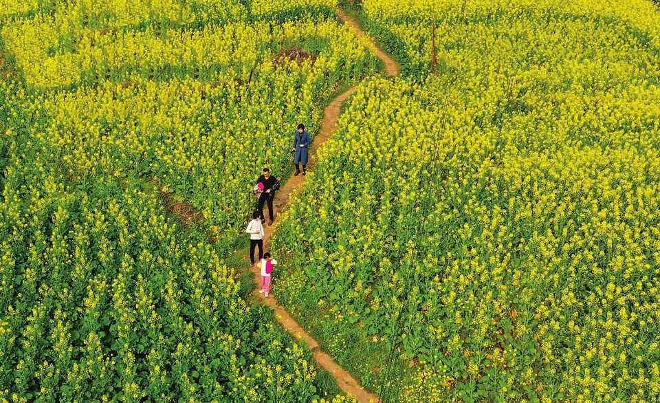 油菜花的盛开带来丰收的希望。 在顺庆区清泉公园旁,大片油菜花正翻滚着黄色的波浪,竞相盛放,游人行走其间, 像一幅浓墨重彩的油画,美轮美奂。