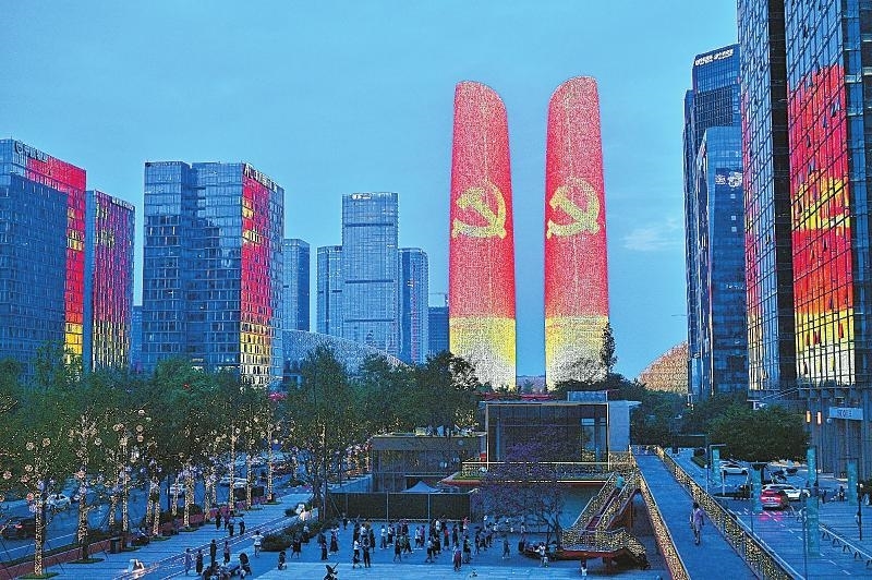 7月1日,成都金融城天府双塔上耀眼的党徽。