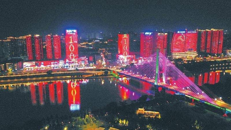 6月24日,南充市顺庆区嘉陵江畔滨江大道一幢幢高楼,在夜幕下变身恢宏幕布、披上灿烂“红妆”,向建党百年献礼。