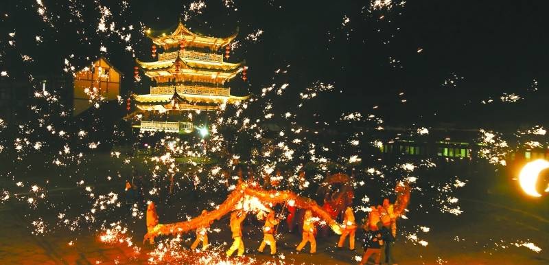 笔者跟随摄制组在录制现场看到,在老观古镇,华灯初上,焰火闪耀,4条彩龙从不同方向向广场中央飞舞盘踞,欢腾的场面令人热血沸腾。