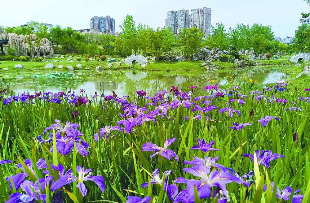 昨(24)日下午,记者在嘉陵区黄金江岸采访看到,在公园多处滨水区域处,紫红色、玫红色的花菖蒲正大面积绽放。娇艳欲滴的花朵在绿叶间随风起舞,将嘉陵江畔装扮得浪漫唯美,不时吸引游人驻足观赏、拍照。