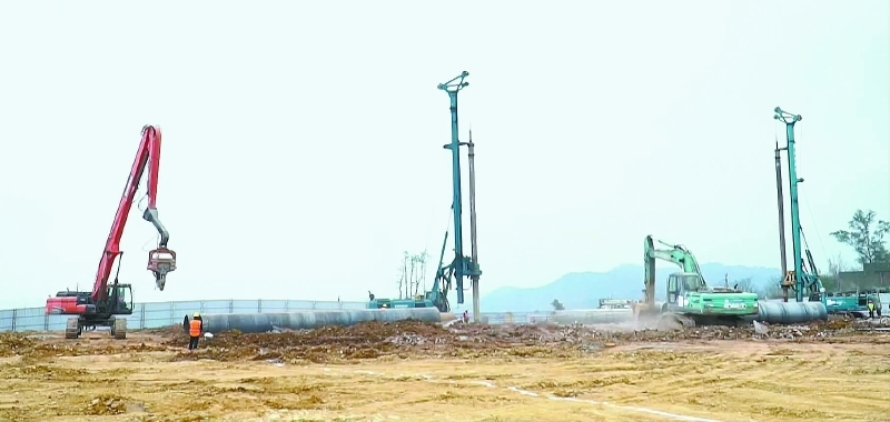 走进南充航空港电子制造科创中心二期项目施工现场,只见2台约10米高的旋挖式钻机正在向地下旋转掘进,旋喷桩钻机与打桩机争鸣,两台挖掘机在隆隆轰鸣声中铲动土石,两台塔吊挥舞“长臂”运送各类建材,数根直径2米左右的大型钢护筒摆放在场内等待埋设,数辆满载渣土的运输车排队开出。在场地一旁空地上,有序堆放着密密匝匝的脚手架、钢材等,70余名建筑工人紧张忙碌着,有的绑扎钢筋,有的焊接钢材。现场一派热火朝天赶工期、抓进度的繁忙景象。