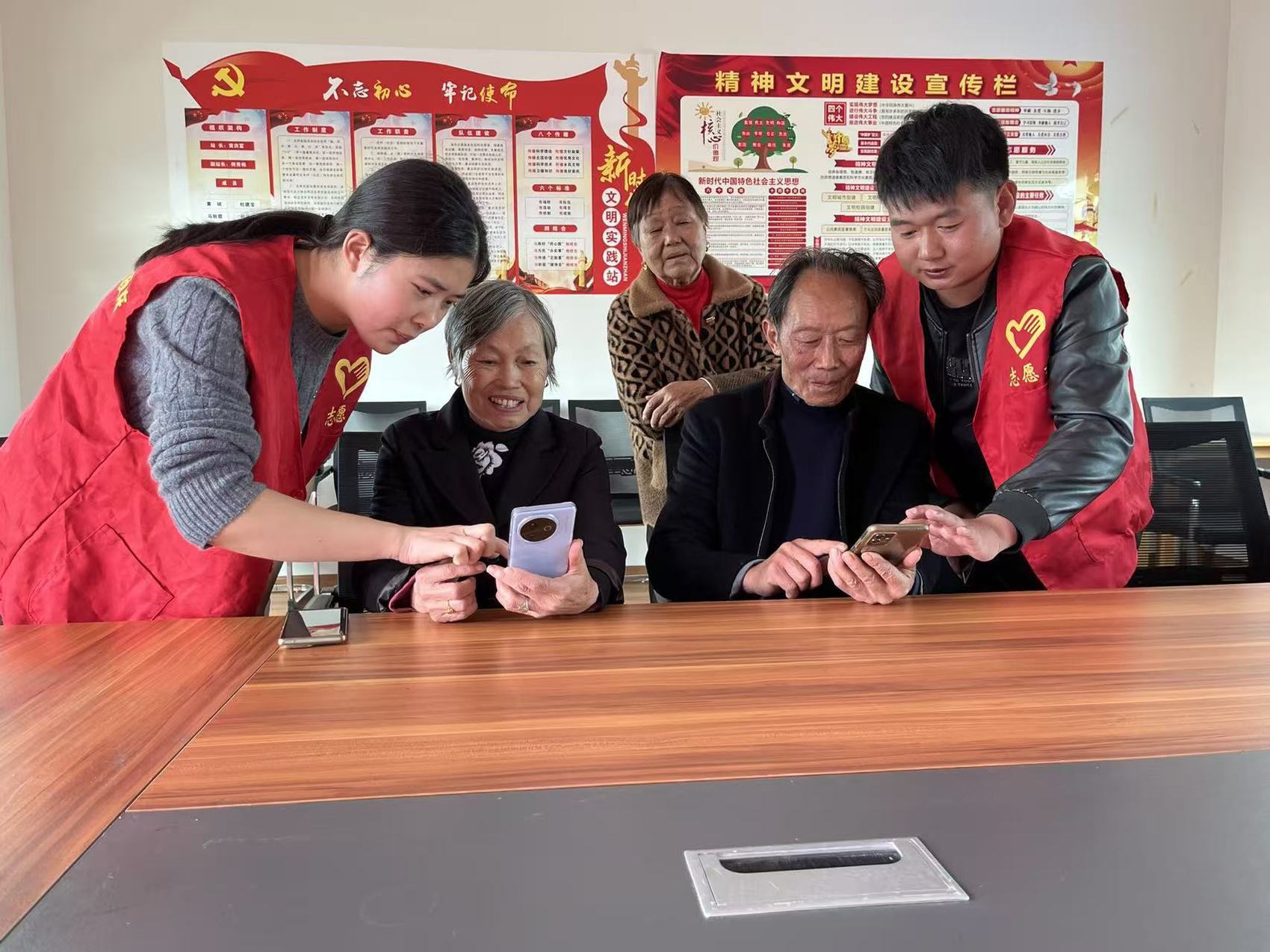 志愿者教老年人使用智能手机。