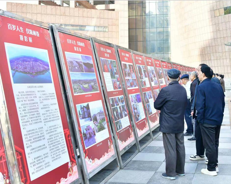 广场两侧,一场“百岁老人・仪陇画卷”主题摄影展成为人气打卡点。百余幅照片生动记录了全县75位百岁老人田间劳作、家庭团聚等生活瞬间,吸引了众多群众驻足观看。