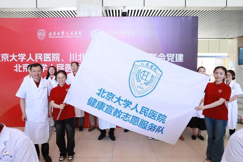 上午9时,健康宣教活动在川北医学院附属医院茂源南路院区门诊大厅拉开帷幕。北京大学人民医院副院长王天兵与川北医学院附属医院副院长唐晓平分别致辞。随着“北京大学人民医院健康宣教志愿服务队”旗帜的庄重交接,一份沉甸甸的为民服务承诺传递到南充。