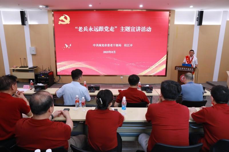 党建活动邀请南充市退役军人事务局老兵红色宣讲团成员杜江平、中共南充市委党校谭燕教授和张瑞卿教授进行专题授课。杜江平以“灾难无情,大爱逆行”为题,用亲身经历讲述了危难时刻党员和医者挺身而出的感人事迹;谭燕从川陕苏区历史切入,深刻阐释了共产党人坚守初心的精神密码;张瑞卿则聚焦“长征精神与医疗工作者的使命担当”,将红军医护的奉献精神与当代医者的职责相融合,呼吁传承“不怕牺牲、坚韧不拔”的长征品格。三场饱含深情的宣讲,为在场人员带来了一场触及灵魂的精神洗礼,筑牢了信仰之基,激发了在新征程上践行医者初心的强大动力。