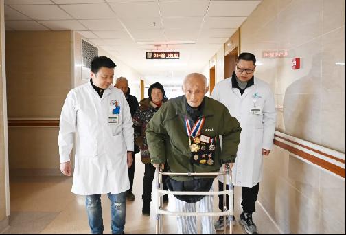 还有103岁的抗日老英雄寇代俊,因跌倒导致股骨头骨折,面对超高龄和多种基础疾病的挑战,吴钢迎难而上,通过多学科协作,仅用50分钟就顺利完成了人工股骨头置换手术,术后第三天老人便能下地活动,创造了百岁老人快速康复的佳话。